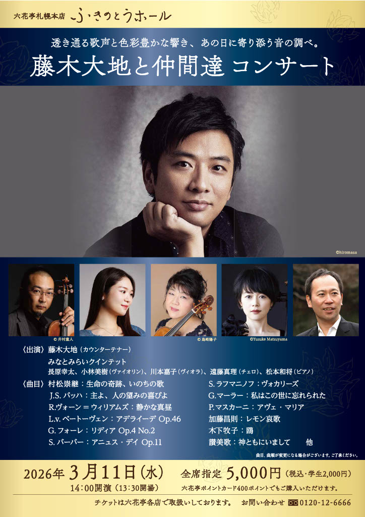SCHEDULE公演情報 2026年3月11日(水)藤木大地と仲間たちコンサート 会場 ふきのとうホール札幌市中央区北4条西6丁目3-3 六花亭札幌本店6階 開場/開演 14:00(開演) 出演者 藤木 大地(カウンターテナー) 長原 幸太(ヴァイオリン) 小林 美樹(ヴァイオリン) 川本 嘉子(ヴィオラ) 遠藤 真理(チェロ) 松本 和将(ピアノ) チケット 5,000円または六花亭ポイントカード400ポイント 公演詳細 https://www.rokkatei.co.jp/hall/fukinoto/ クリックして画像を拡大 CONCERT TOP