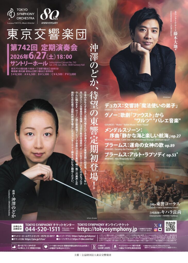 SCHEDULE公演情報 2026年6月27日(土)東京交響楽団 第742回定期演奏会 会場 サントリーホール 開場/開演 18:00(開演) 出演者 指揮:沖澤のどか 東京交響楽団 カウンターテナー:藤木大地 合唱:東響コーラス チケット S¥8,500 A¥6,500 B¥5,500 C¥4,500 P¥3,000 公演詳細 https://tokyosymphony.jp/wp-content/themes/tso/assets/img/pamphlet/2026pamphlet.pdf クリックして画像を拡大 CONCERT TOP